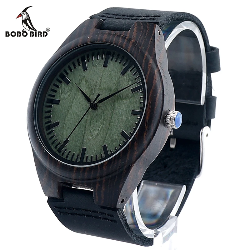 Goede Koop BOBO VOGEL Mens Groen Hout Gezicht Houten Bamboe Horloges Luxe houten Bamboe Horloges Met Lederen Quartz Horloge Met Bamboe Doos 2017 Goedkoop