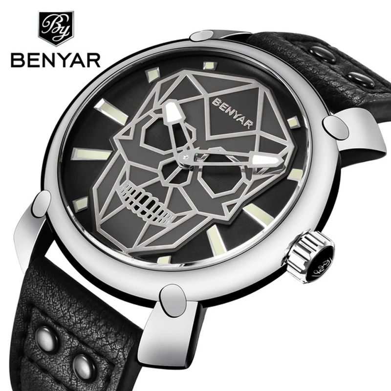 Kopen Goedkoop BENYAR Mode Sport Skull Design Horloge Mannen Horloges Topmerk Luxe Lederen Band Quartz Horloge Klok Mannen Relogio Masculino Online