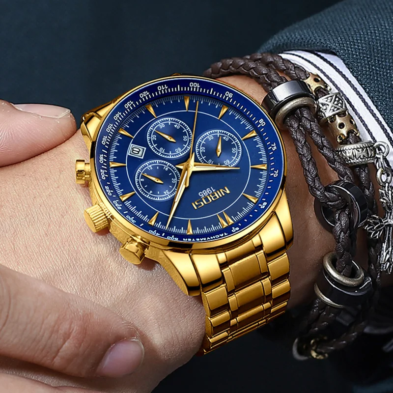 Beste Koop NIBOSI mannen Horloge 2018 Luxe Blauw Rvs Man Horloge Met Kalender Gouden Horloge Mannen Grote Wijzerplaat Horloges Mannen luxe Merk Goedkoop