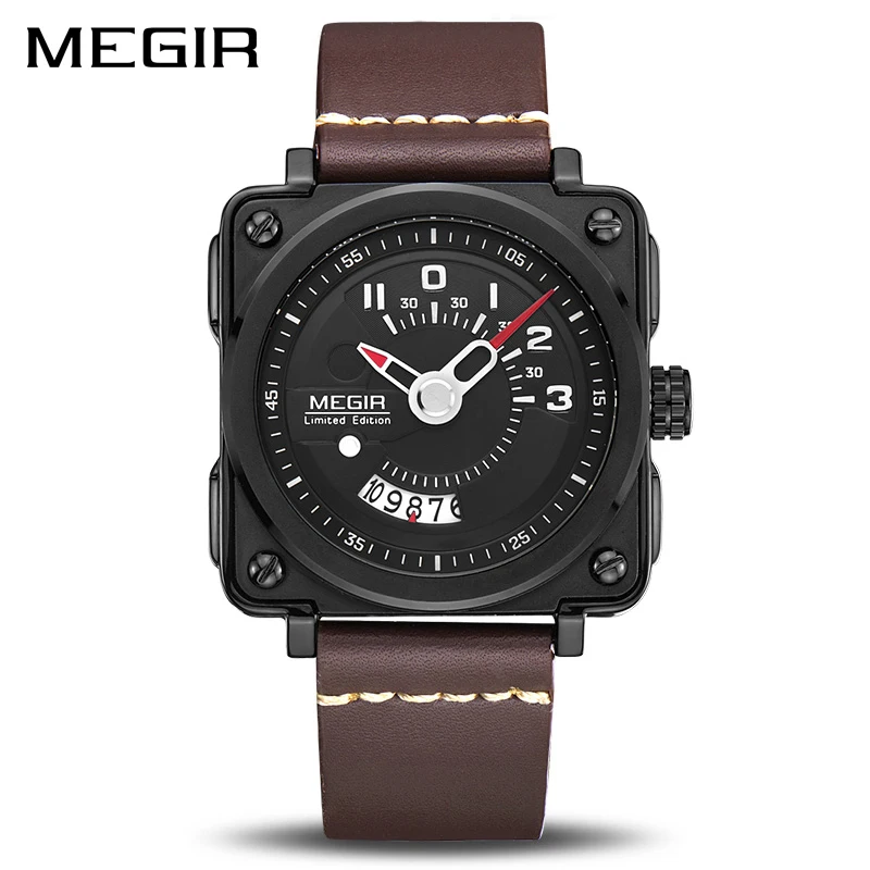 Beste Kopen MEGIR Sport Mannen Horloge Lederen Band Vierkante Relogio Masculino Klok Mannen Quartz Militaire Horloges Reloj Hombre met Horloge Doos 2040 Goedkoop