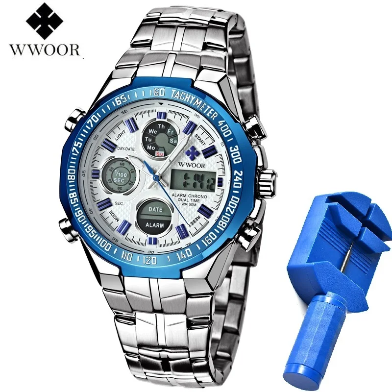 Kopen Goedkoop WWOOR Dual Display Man Horloge Chronograaf Alarm Waterdichte Blauwe LED Horloge Mannen Sport Quartz Horloge Kalender Week Mannelijke Klok Prijs